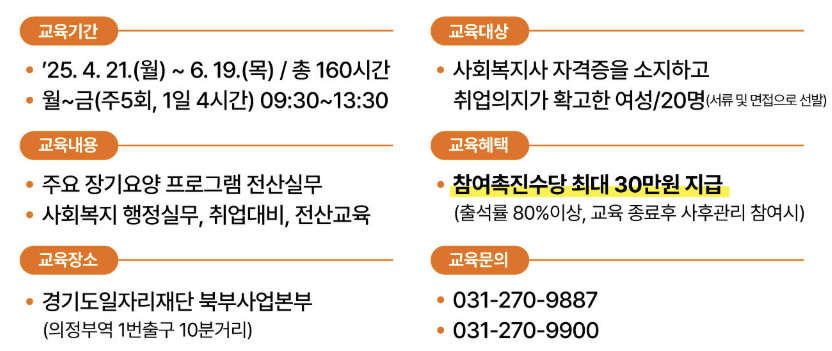 2025년 여성가족부 직업교육훈련 사회복지사 실무인력 양성과정  교육생 모집   [교육정보]   1. 모집기간 : ‘25. 3. 10.(월) ~ 4. 10.(목) 2. 모집인원 : 20명 3. 교육기간 : ‘25. 4. 21.(월) ~ 6. 19.(목) ※
