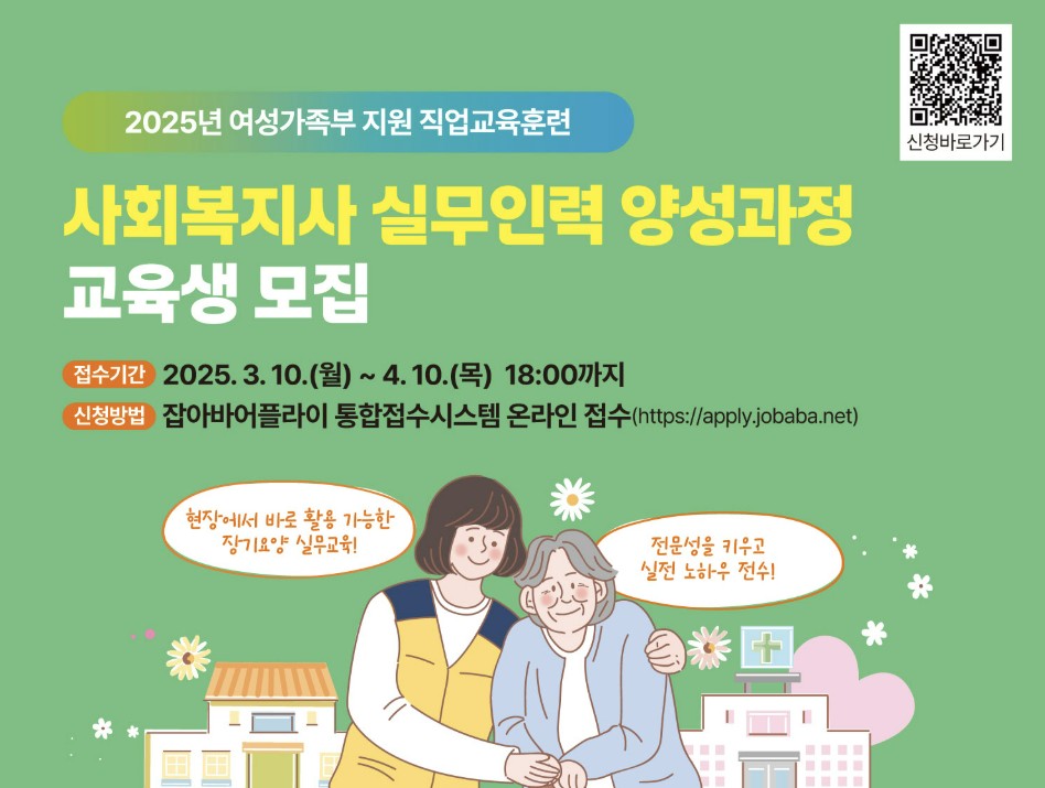 2025년 여성가족부 직업교육훈련 사회복지사 실무인력 양성과정 교육생 모집 [교육정보] 1. 모집기간 : ‘25. 3. 10.(월) ~ 4. 10.(목) 2. 모집인원 : 20명 3. 교육기간 : ‘25. 4. 21.(월) ~ 6. 19.(목) ※