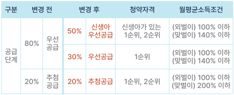* 신혼부부 특별공급처럼 신생아우선공급이 있는 '생애최초 특별공급'은 변경되지 않음
