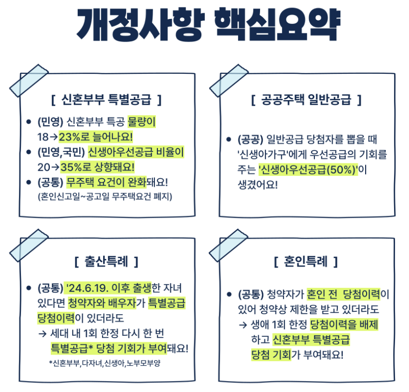 안녕하세요, 얼마 전 개정된 청약 제도 확인하셨나요? 지난해 6월 정부가 발표한 '저출생 추세 반전을 위한 대책'의 후속 조치로, '25.3.31.부터, 신혼부부 또는 2세 미만 자녀(태아 포함)를 둔 '신생아 가구'는 공공 / 민양 분양 주택에서 청약 기회를 우선 배정받게 됩니다. 관련 내용 꼼꼼히 챙겨서 '내 집 마련' 성공하세요 :)