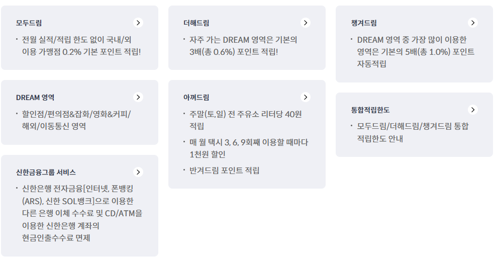 | 주요 혜택 | - 전월 실적/한도없이 포인트 적립 - 주유 적립, 택시 할인 - 신한 금융그룹 서비스 수수료 우대 |