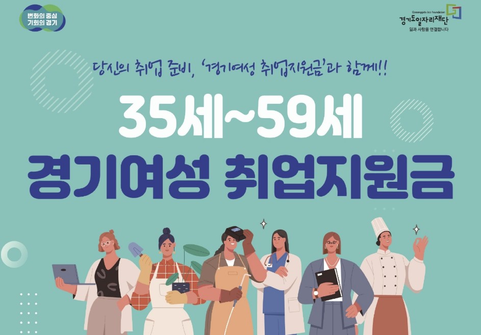 ○ 지원대상 : 경기도에 1년 이상 거주하고 기준 중위소득 150% 이하 가구에 속한 적극적 구직의사가 있는 35세~59세 미취업 여성