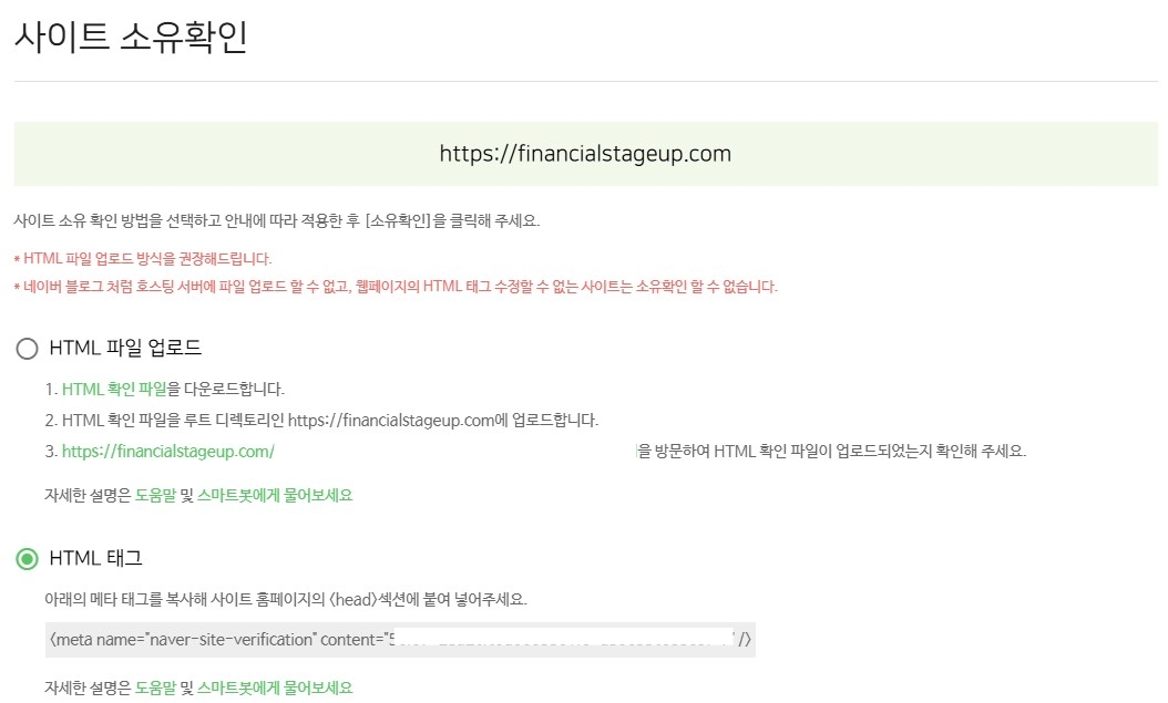 ○ HTML 태그 선택 후 아래 메타 태그 복사 → 티스토리 관리 페이지로 이동