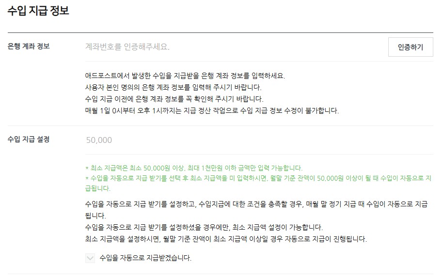 최소 지급액은 50,000원 이상이고, 자동 지급받기를 누르면 월말 기준 잔액이 최소 지급액 이상일 경우 자동으로 지급이 진행됩니다.