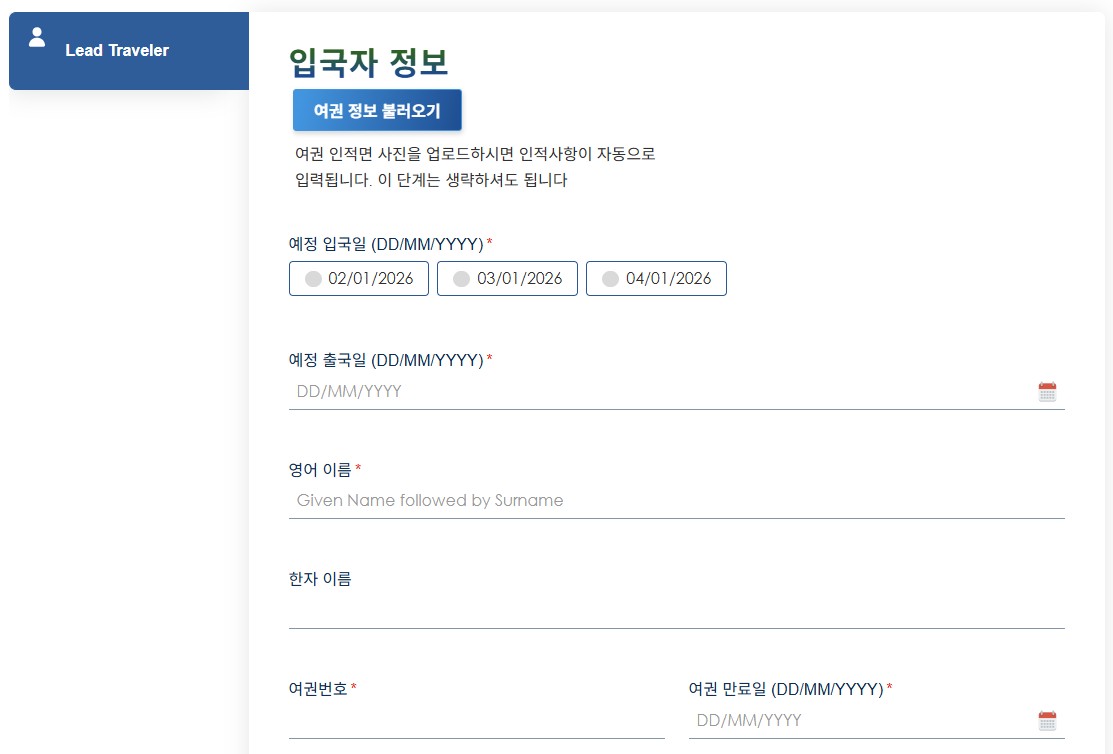 ✔️ 입국자 정보 입력 단계! → 여권 사진 업로드 하는 방법도 있는데 저는 그냥 필수 항목들 직접 입력했어요 ㅎㅎ